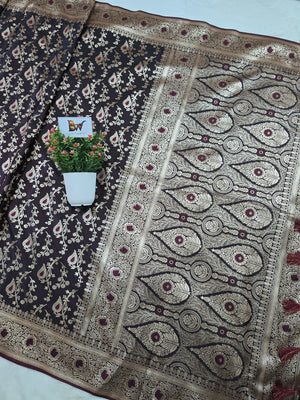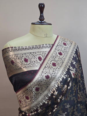 The saree is beautifully framed with a stunning meenakari floral jaal border, adding heritage charm and intricate artistry to the overall design. Soft, smooth, and designed for a graceful drape, this piece is ideal for weddings, festive celebrations, and traditional functions where you want to look regal yet refined.