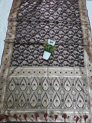 Experience timeless Banarasi craftsmanship with this luxurious Satin Malai Katan Saree, adorned with delicate meenakari booti jaal work throughout the body. The rich rose-gold zari detailing enhances the intricate motifs, giving the saree a sophisticated sheen and a classic Banarasi elegance that stands out effortlessly for any grand occasion.