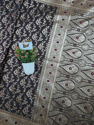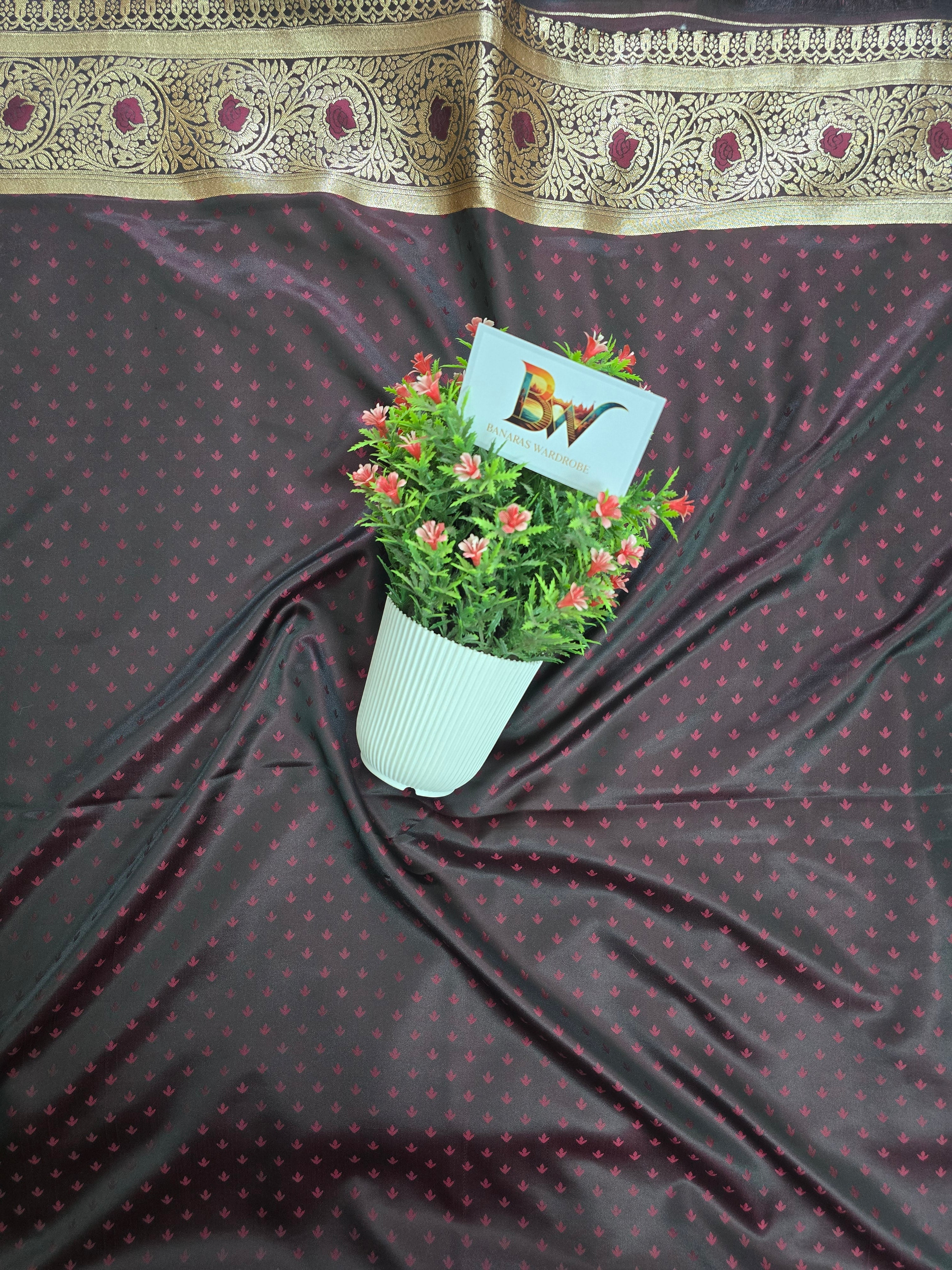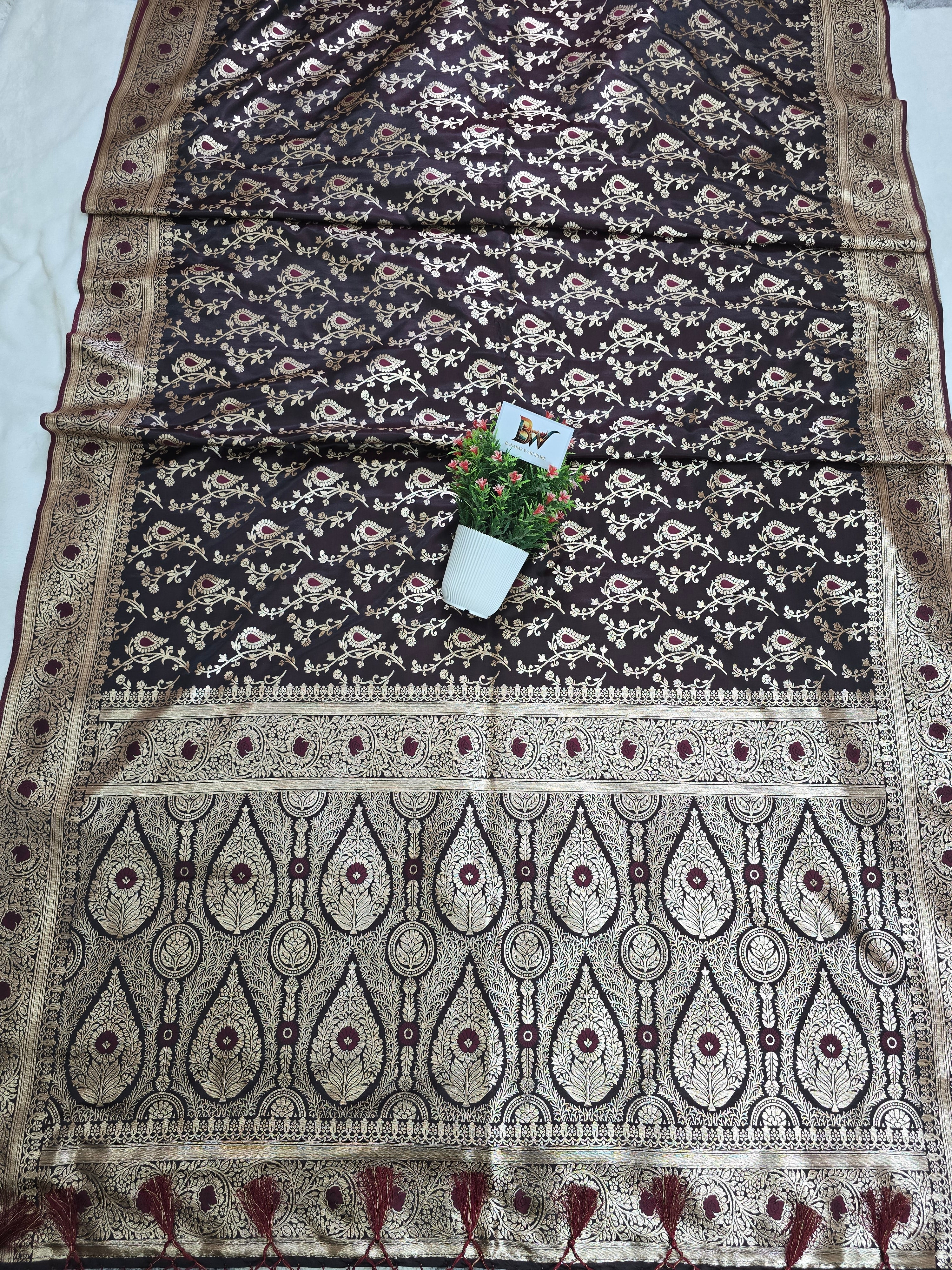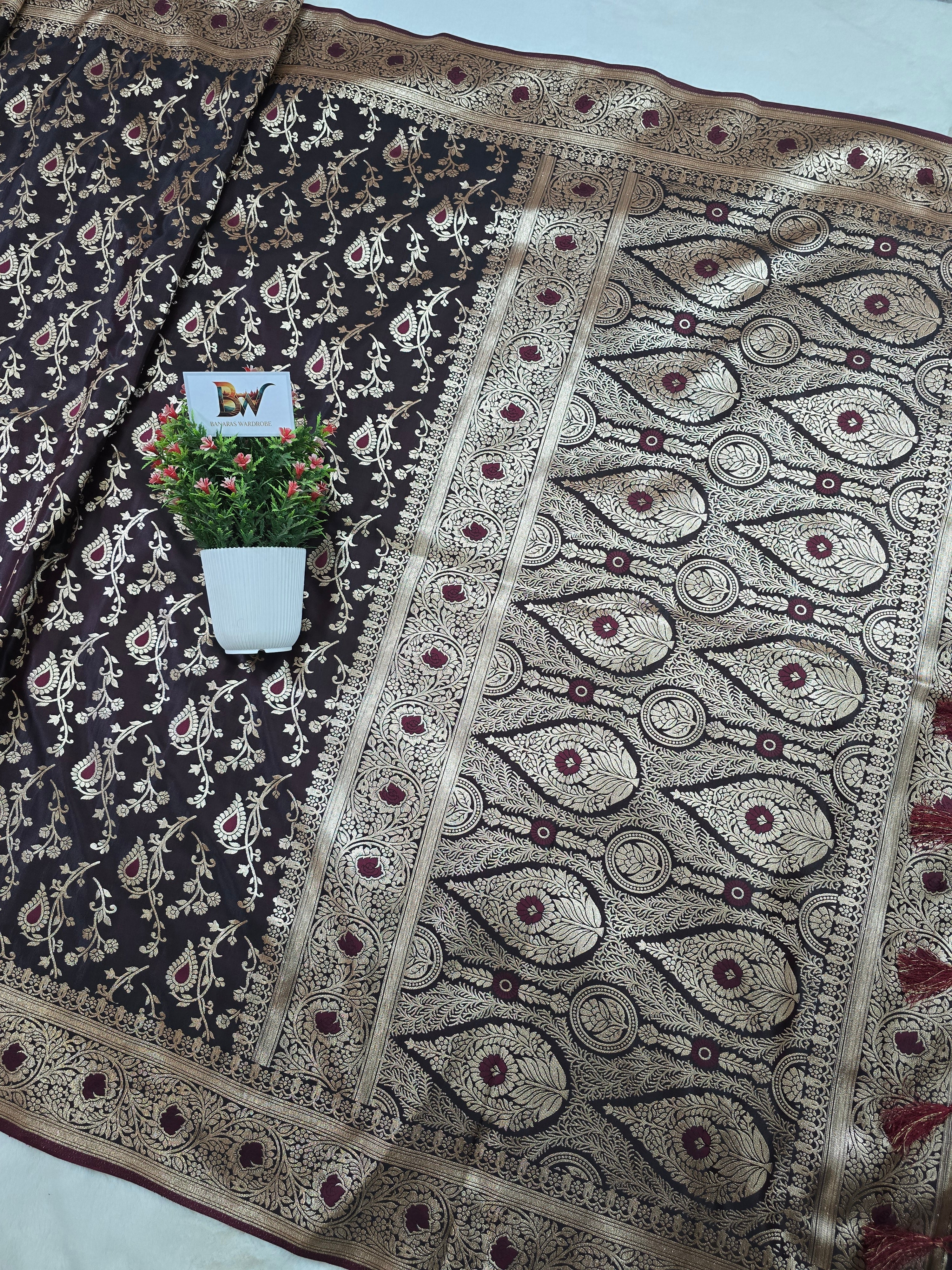 Satin Malai Katan Banarasi Saree – Meenakari Booti Jaal with Rose Gold Zari