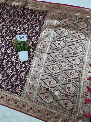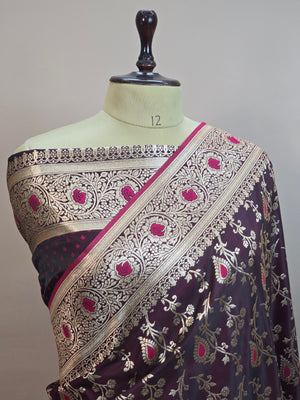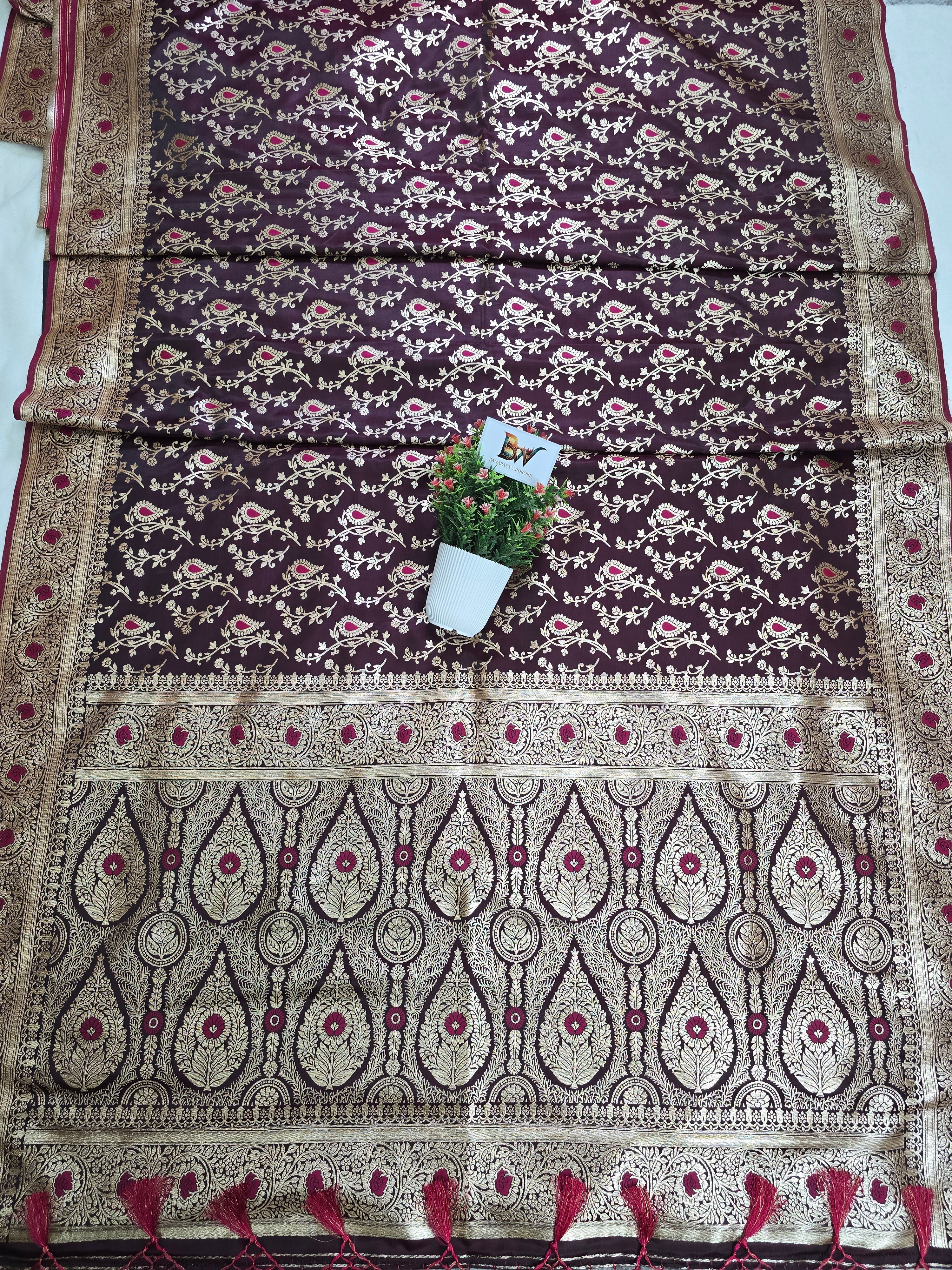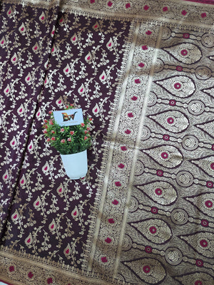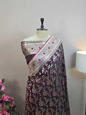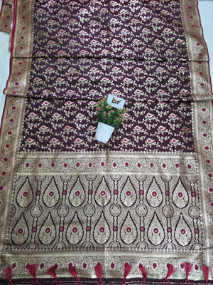 The saree is beautifully framed with a stunning meenakari floral jaal border, adding heritage charm and intricate artistry to the overall design. Soft, smooth, and designed for a graceful drape, this piece is ideal for weddings, festive celebrations, and traditional functions where you want to look regal yet refined.