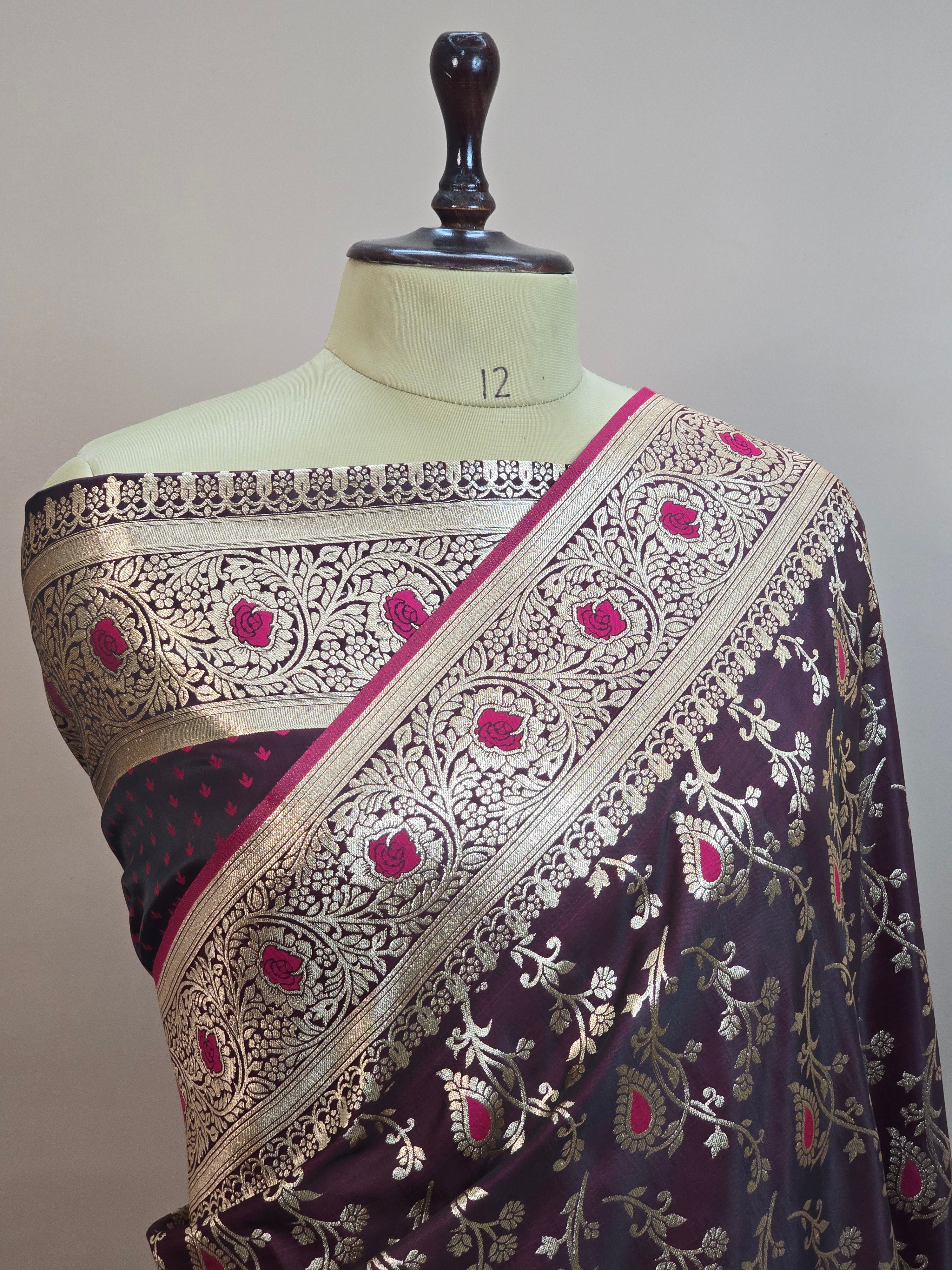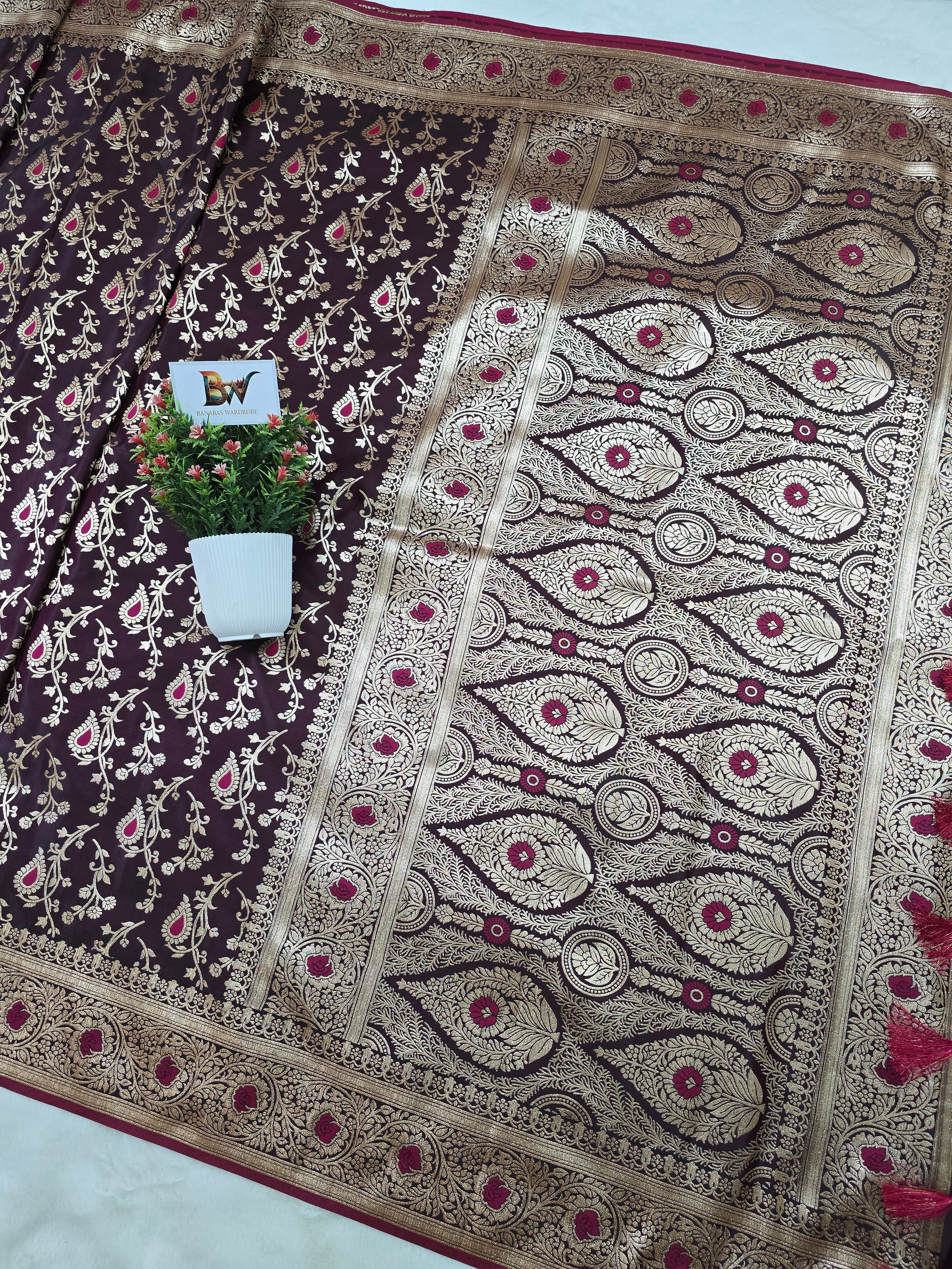 Satin Malai Katan Banarasi Saree – Meenakari Booti Jaal with Rose Gold Zari