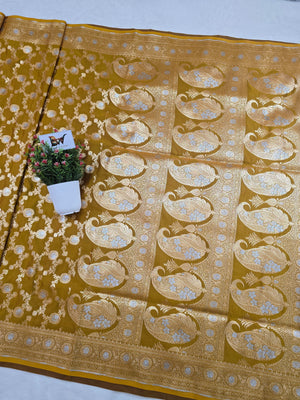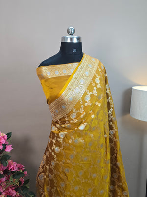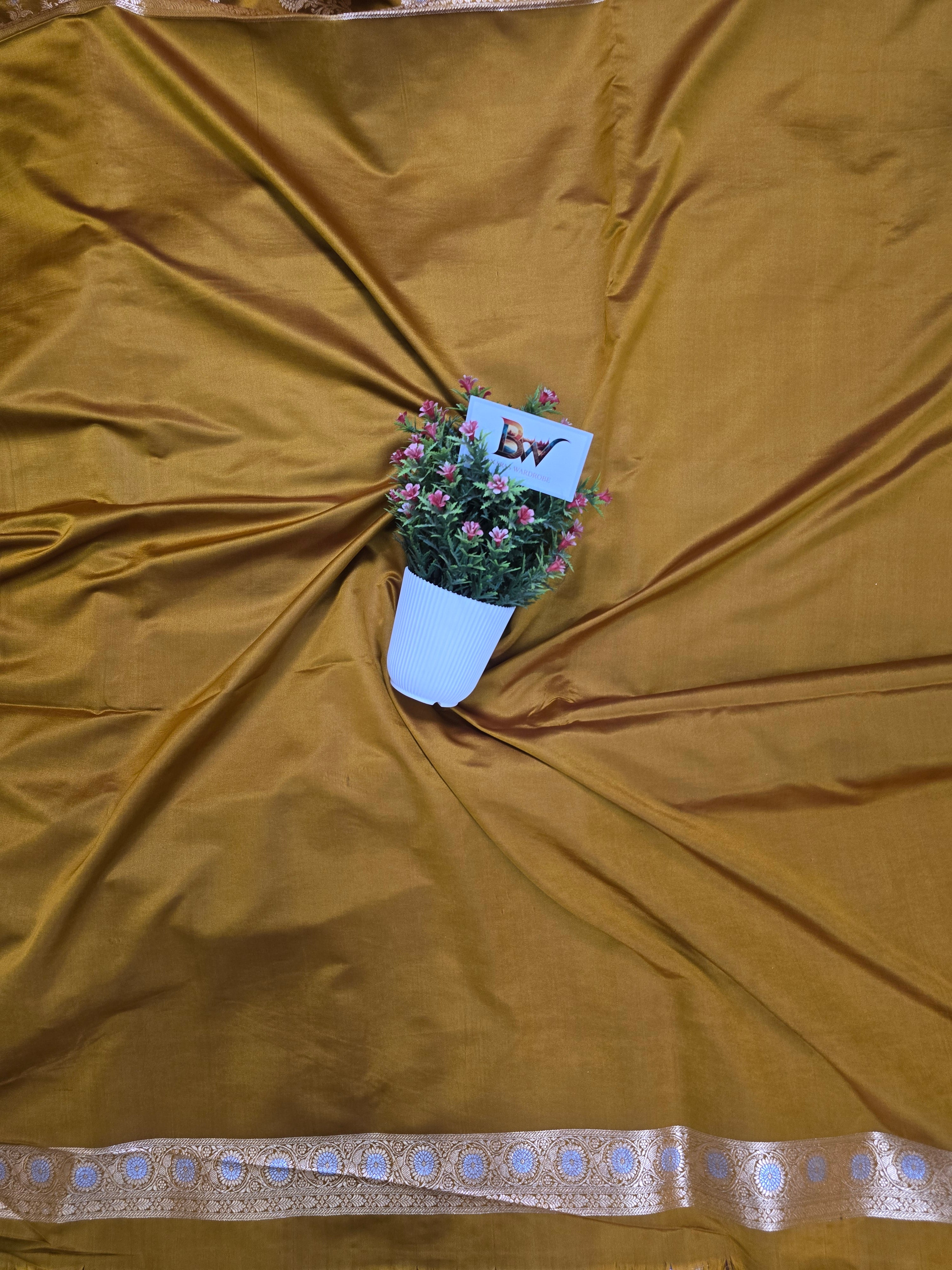 The saree features a beautifully woven sona–roopa meenakari floral border in a refined jaal pattern, adding a statement finish that elevates the entire look. Comfortable, smooth, and effortlessly graceful, this masterpiece blends tradition with a modern, regal appeal—ideal for women who appreciate premium, handwoven Banarasi artistry.