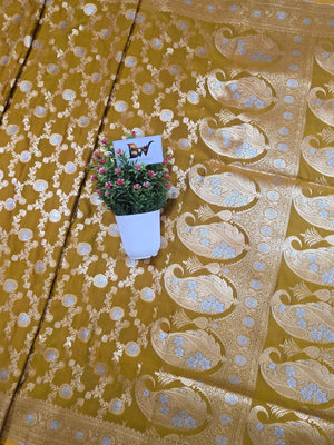 Experience timeless Banarasi elegance with this exquisite Satin Malai Katan Silk Saree, crafted with luxurious sona–roopa zari weaving. The all-over meenakari jaal brings delicate artistry to life, while the soft, lustrous drape enhances its rich traditional charm. Perfect for weddings, festive events, and grand celebrations, this saree captures the essence of heritage craftsmanship in every detail.