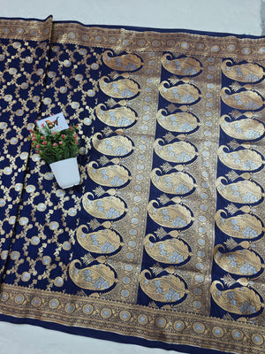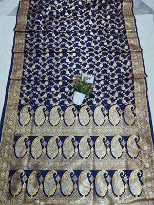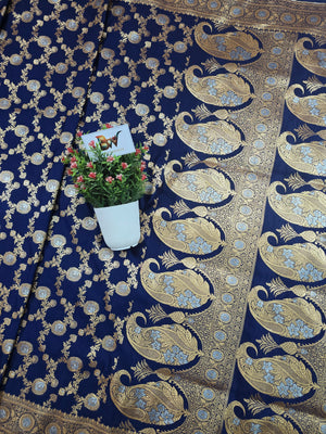 The saree features a beautifully woven sona–roopa meenakari floral border in a refined jaal pattern, adding a statement finish that elevates the entire look. Comfortable, smooth, and effortlessly graceful, this masterpiece blends tradition with a modern, regal appeal—ideal for women who appreciate premium, handwoven Banarasi artistry.