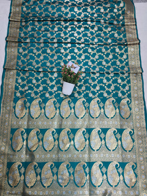 The saree features a beautifully woven sona–roopa meenakari floral border in a refined jaal pattern, adding a statement finish that elevates the entire look. Comfortable, smooth, and effortlessly graceful, this masterpiece blends tradition with a modern, regal appeal—ideal for women who appreciate premium, handwoven Banarasi artistry.