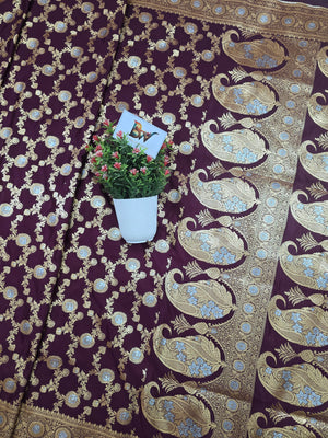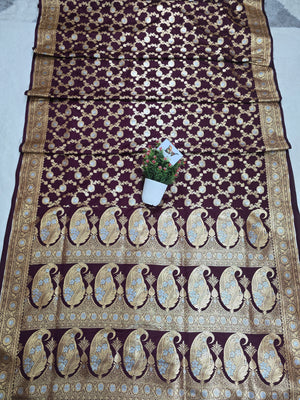 The saree features a beautifully woven sona–roopa meenakari floral border in a refined jaal pattern, adding a statement finish that elevates the entire look. Comfortable, smooth, and effortlessly graceful, this masterpiece blends tradition with a modern, regal appeal—ideal for women who appreciate premium, handwoven Banarasi artistry.