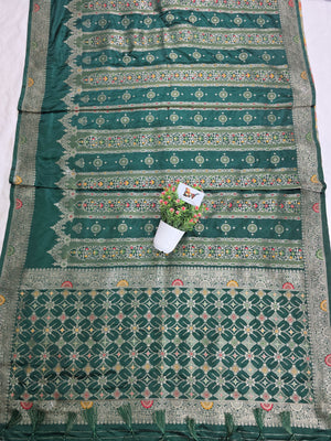 Experience the artistry of traditional Banarasi weaving with this elegant Satin Mashru Silk Tilfi Saree. Crafted in luxurious mashru satin, it features signature Tilfi-style stripe weaving enriched with intricate meenakari floral motifs, giving it a rich and timeless appeal. The smooth silk finish adds a graceful fall and a natural sheen that elevates any festive or formal look.