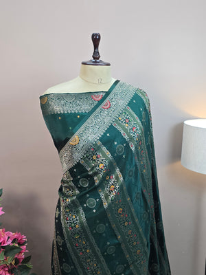 The saree is complemented by a beautifully detailed meenakari border that highlights the craftsmanship and sophistication of classic Banarasi heritage. Perfect for weddings, festive occasions, and special celebrations, this saree blends luxurious texture with stunning handwoven artistry.